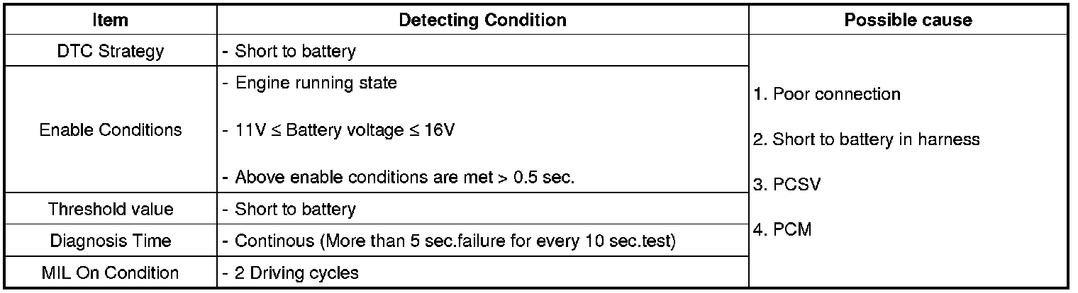 Checking output signals from PCSV every 10 sec. under detecting condition, if signals indicating short to battery in the circuit are detected for more than 5 sec., PCM sets P0445.