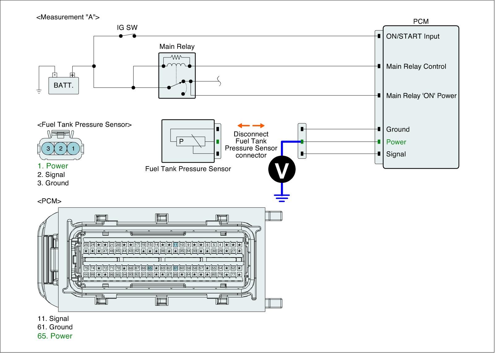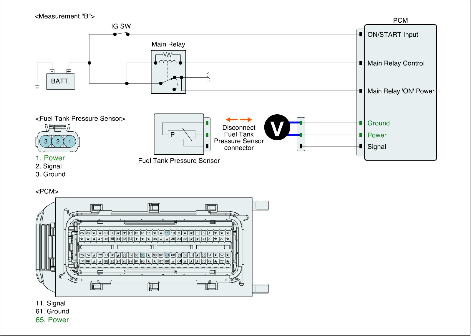 4. Measure the voltage between power and ground terminals of FTPS harness connector. (Measurement "B")