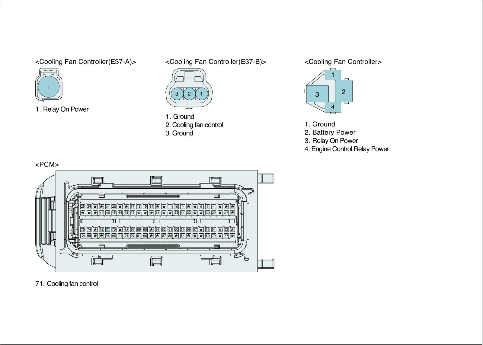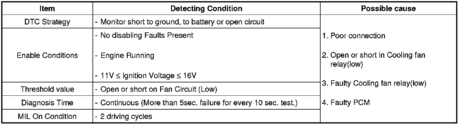 Checking power supply to cooling fan relay, cooling fan module and control signals under detecting condition, if the PCM detects short to ground, to battery or open circuit, ECM sets P0480. MIL (Malfunction Indication Lamp) turns on when the malfunction lasts till consecutive 2 driving cycle.
