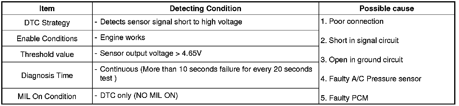 Checking output signals from A/C pressure sensor under detecting condition, if an signal above 4.65 V lasts for more than 10 sec., PCM sets P0533.