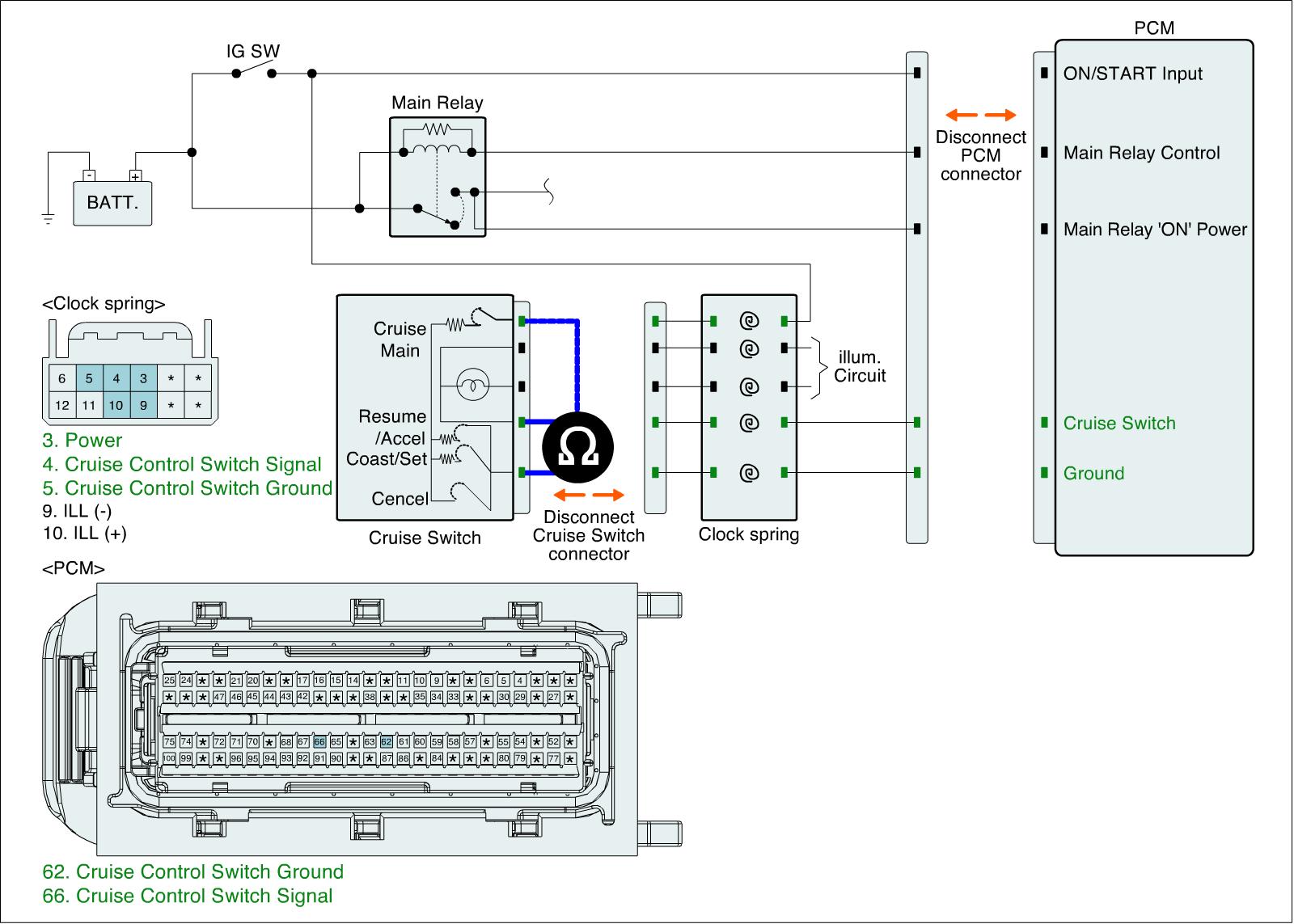 2. Measure resistance between signal and ground terminals of Cruise switch connector with 'RESUME' switch depressed. (Component side)