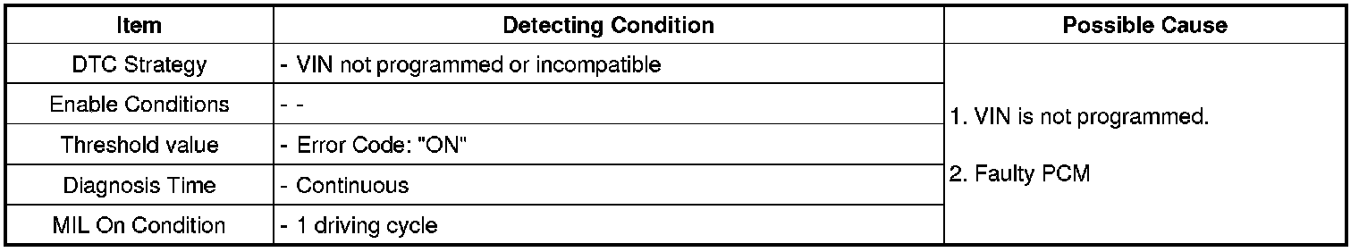 The purpose of this logic is to prevent a vehicle from leaving the assembly plant or service station without a VIN in its EEPROM memory. If the VIN writing is not programmed or incompatible, the PCM determines that a fault exists and a DTC is stored.
