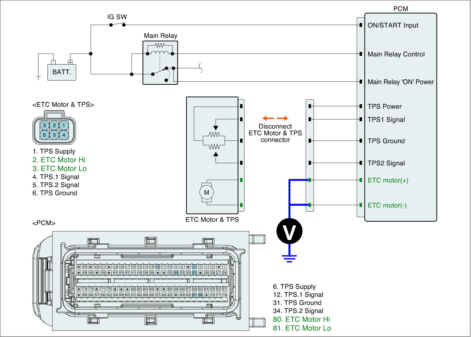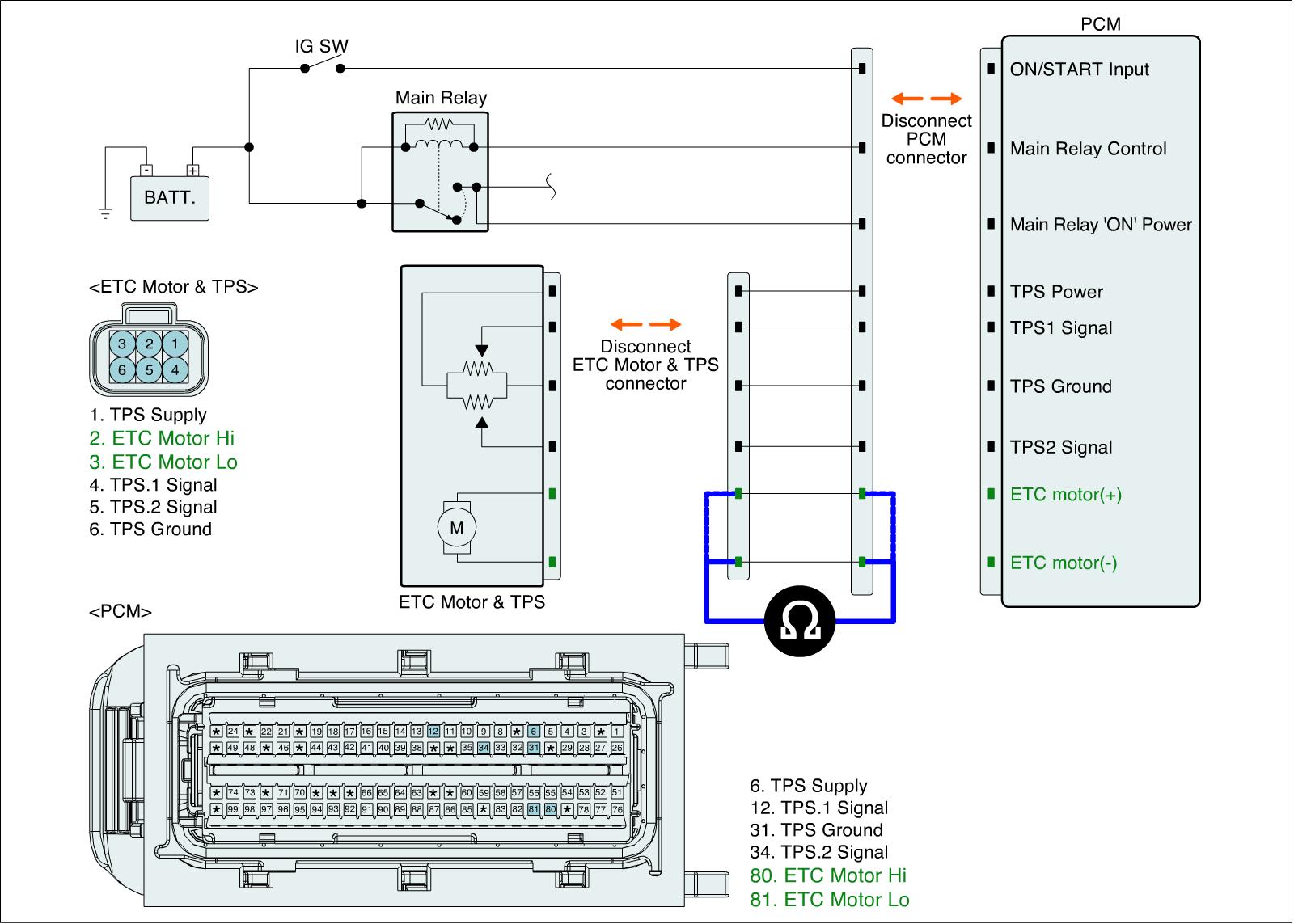 1. IG "OFF" and disconnect ETC Motor & TPS connector and PCM connector.