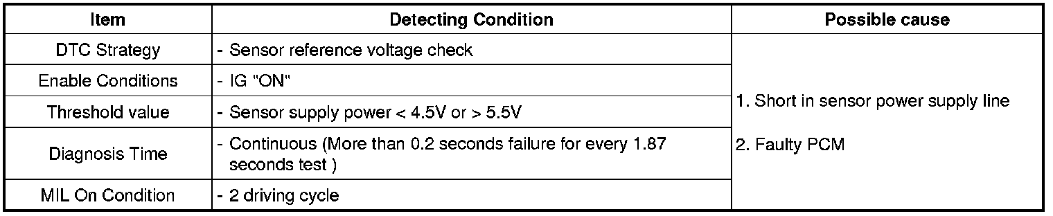 Checking the voltage from sensor power supply every 1.87 sec. under detecting condition, if the value within detecting condition lasts for more than 0.2 sec., PCM sets P0641.