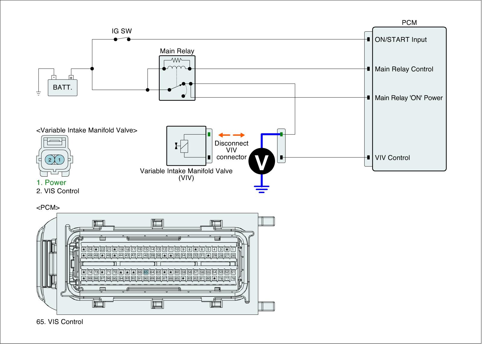 3. Measure voltage between power terminal of VIV harness connector and chassis ground.