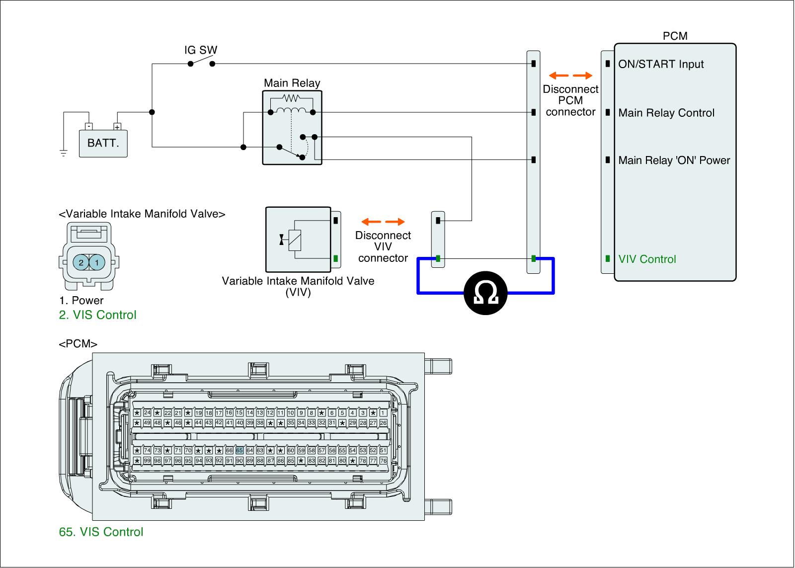 2. Measure resistance between control terminal of VIV harness connector and VIV control terminal of PCM harness connector.