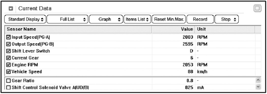 3. Select "Current Data" mode and monitor "Engine speed, Input speed sensor (PG-A), Output speed sensor (PG-B) and Gear position" parameter used select option.