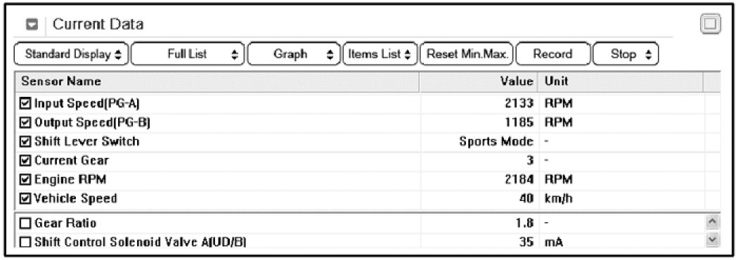 3. Select "Current Data" mode and monitor "Engine speed, Input speed sensor (PG-A), Output speed sensor (PG-B) and Gear position" parameter used select option.