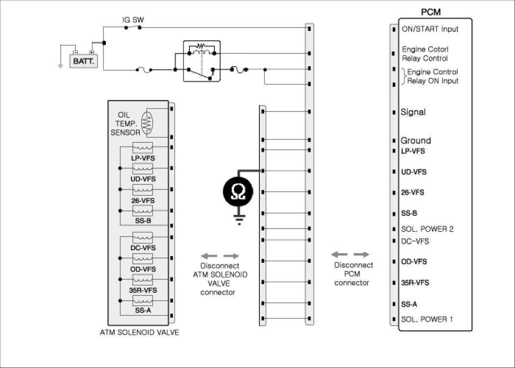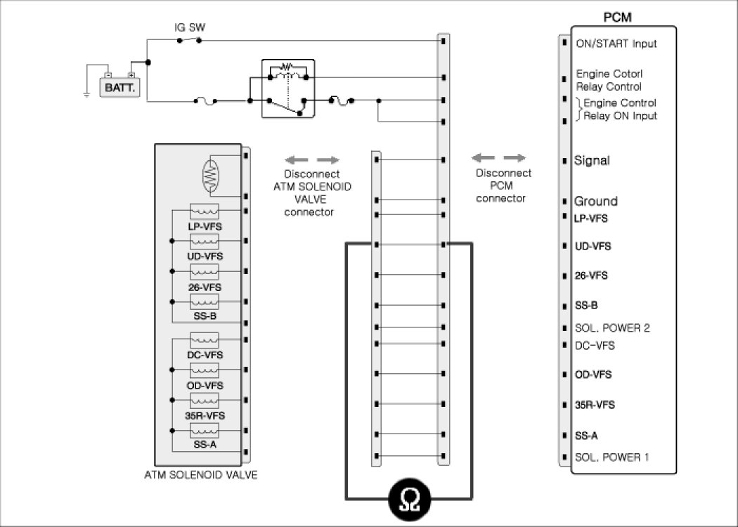 2. Disconnected "ATM solenoid valve connector and PCM/TCM connector.