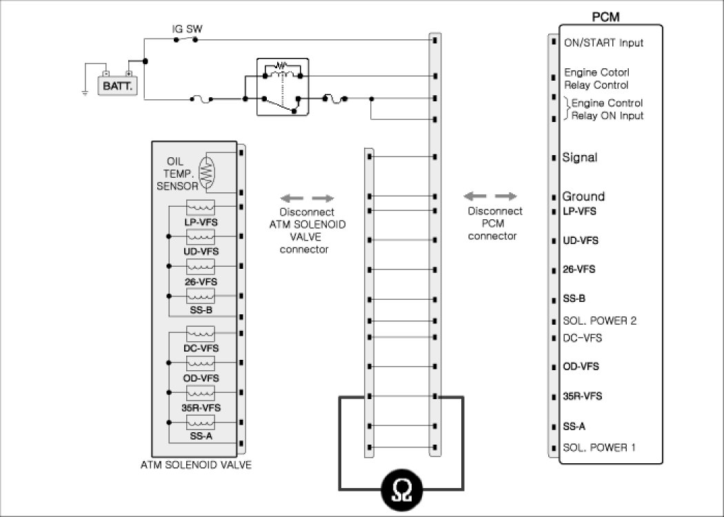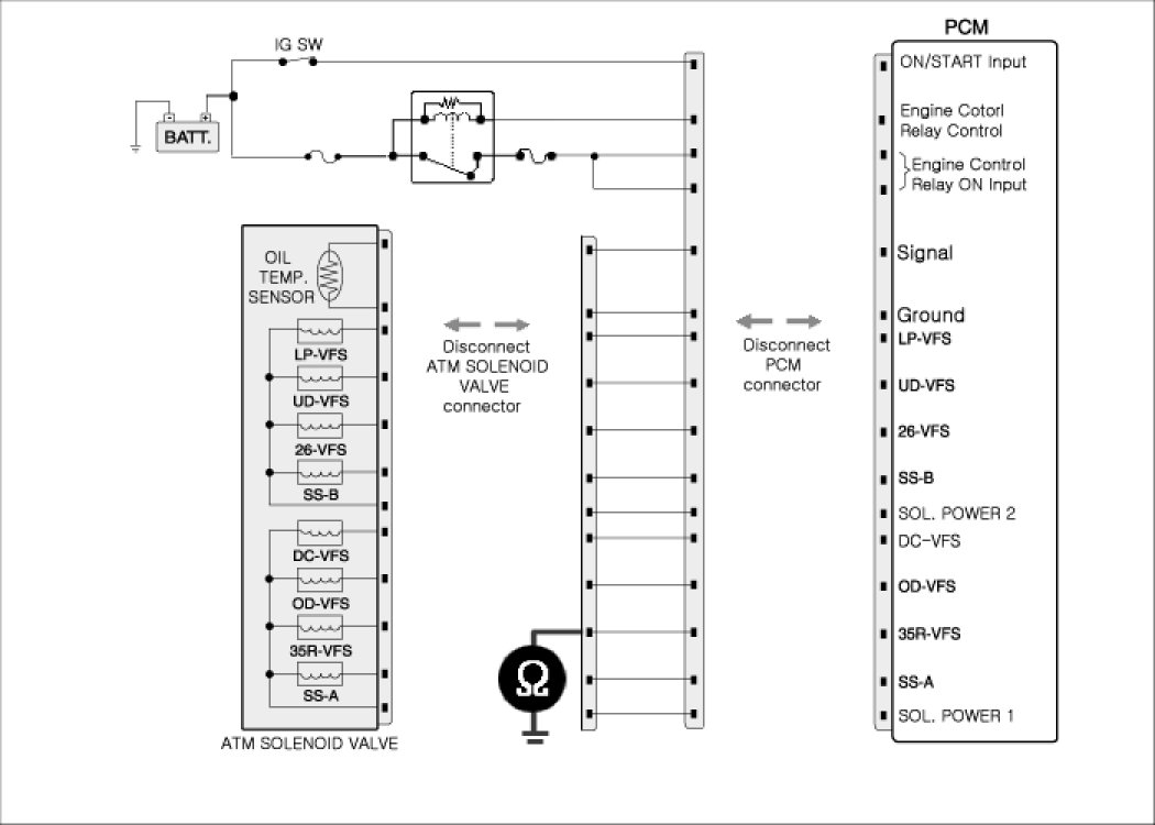 2. Disconnected "ATM solenoid valve connector and PCM/TCM connector.