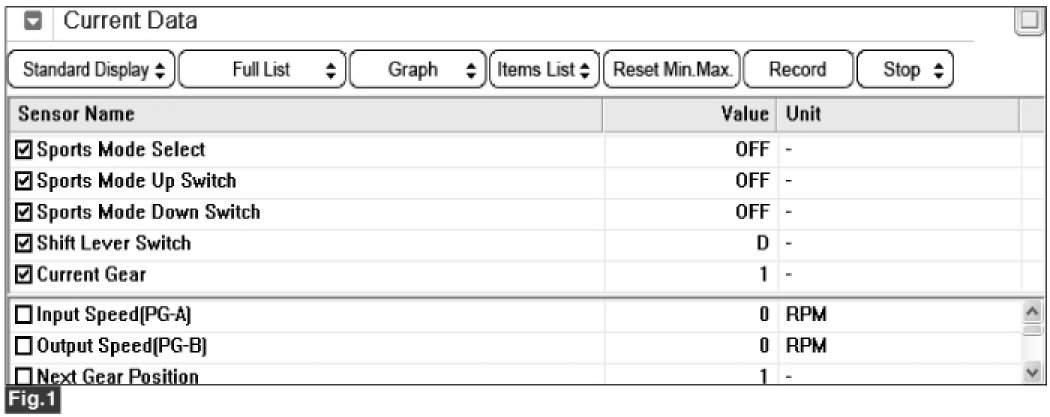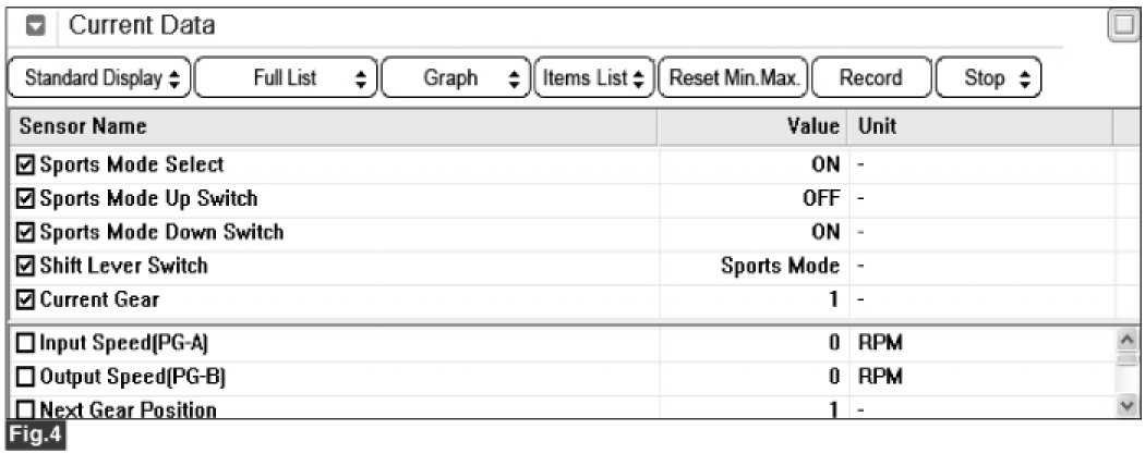 3. Select "Current Data" mode and monitor "SPORTS MODE SELECT S/W, SPORTS MODE UP S/W, SPORTS MODE DOWN S/W" parameters.