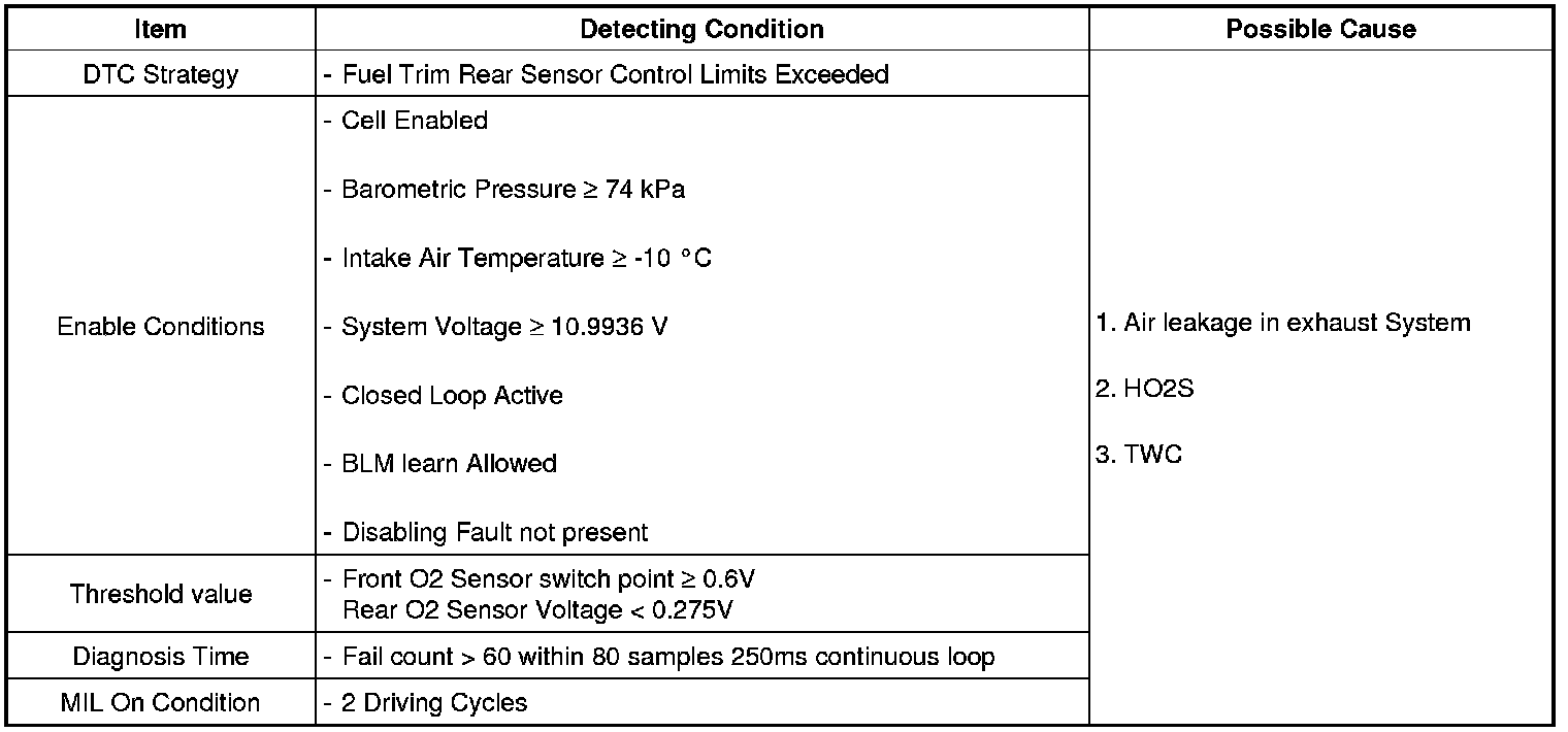 If the lambda controller reaches the maximum or minimum threshold, then feedback control is no longer possible and emissions will be increased. The PCM sets DTC P2096 if no proportional post catalyst fuel trim adaptation occurs for a defined time after the lambda controller has reached its maximum threshold.