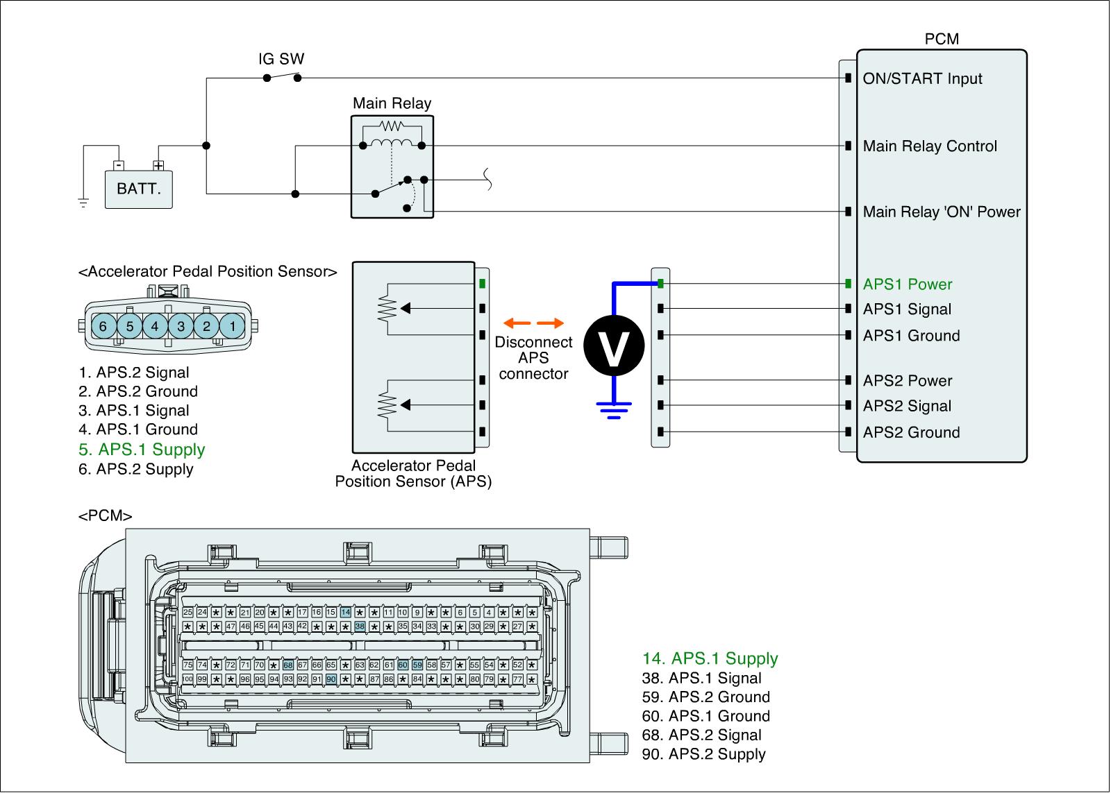 3. Measure voltage between APS1 power terminal of APS harness connector and chassis ground.