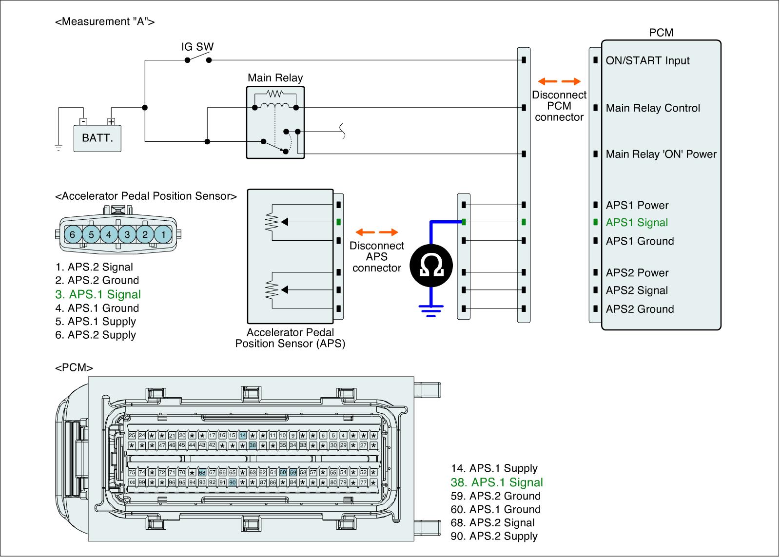 2. Measure resistance between APS1 signal terminal of APS harness connector and APS1 signal terminal of PCM harness connector.
