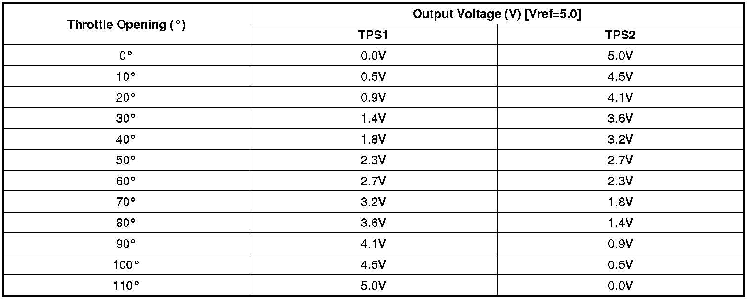 The Electronic Throttle Control (ETC) system is made of the components throttle body, Throttle Position Sensor (TPS) 1&2 and Accelerator Position Sensor (APS) 1&2. TPS1&2 are sharing the same source voltage and ground. The throttle valve opening is control by throttle motor which is controlled by Engine Control Module (PCM). The opposite position indicator shows inverted signal characteristics. TPS1 output voltage increases smoothly in proportion with the throttle valve opening angle after starting. TPS2 output voltage decreases in inverse proportion with the throttle valve opening angle after starting. TPS provides feedback to the PCM to control the throttle motor in order to control the throttle valve opening angle properly in response to the driving condition.