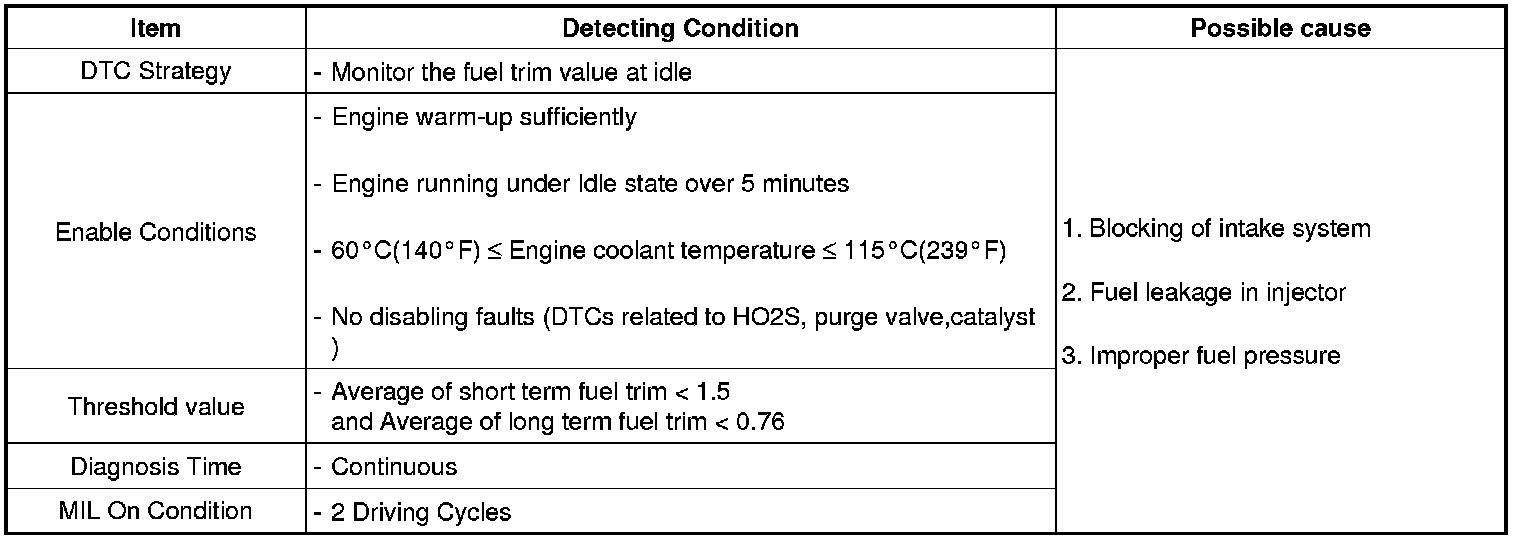 Checking the fuel trim value at idle under detecting condition, if its average exceeds the limit over certain period, PCM sets P2188.
