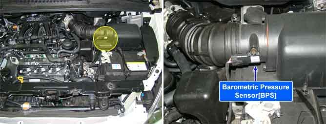 The Barometric Pressure Sensor (BPS) is located between the air cleaner assembly and the throttle body. It detects the atmospheric pressure at the vehicle's current location. The barometric pressure sensor calculates the density of air (quantity of oxygen) and accurately detects the intake air amount along with intake air temperature sensor. This does an important role in compensating the amount of fuel when driving in hillsides areas where difference in air density (oxygen) exists.