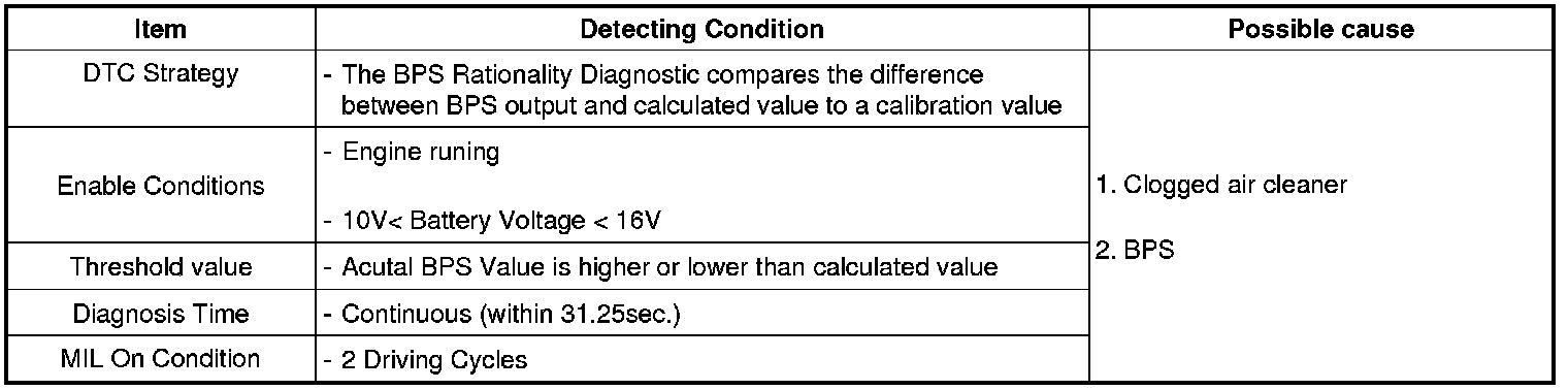 The difference between values coming from the BPS Sensor and those are calculated is analyzed. PCM compares the difference between BPS output and calculated value while enable condition is met.