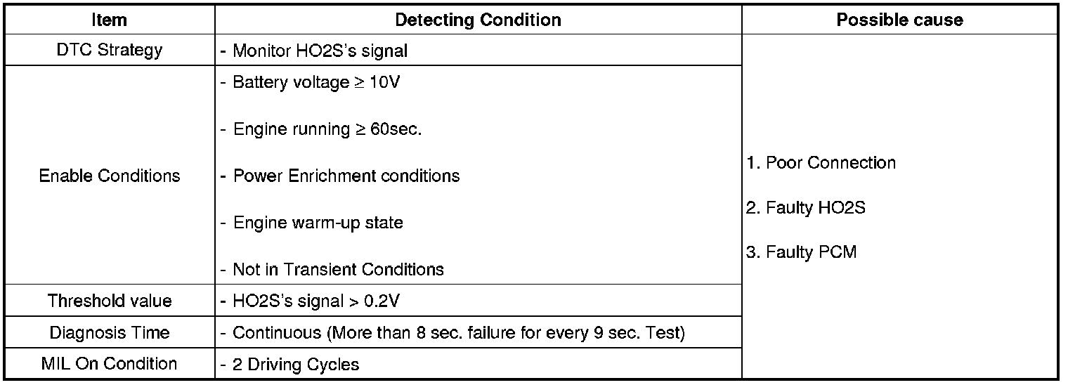 Checking output signals from HO2S under detecting condition, if HO2S's signal is rich during fuel cut-off conditions, PCM sets P2273. MIL (Malfunction Indication Lamp) turns on when the malfunction lasts till consecutive 2 driving cycles.