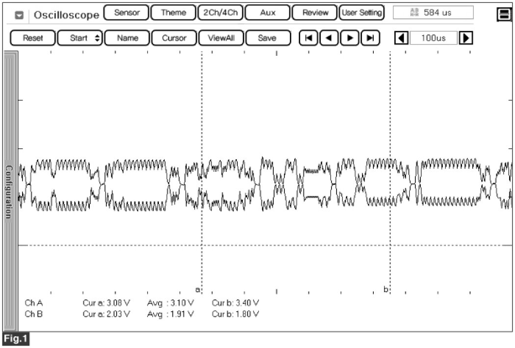 Monitoring CAN HIGH and LOW simultaneously is important in monitoring CAN communication waveform. When CAN HIGH signal rise to 3.5 V and LOW signal drops to 1.5 V - voltage difference between HIGH and LOW signal is 2 V - at BUS IDLE state (DIGITAL "1") whose reference voltage is 2.5 V, "0" is recognized. Besides, comparing HIGH and LOW signal if opposite waveform is detected with the reference voltage of 2.5 V, Check if current cam signal transfers correctly.