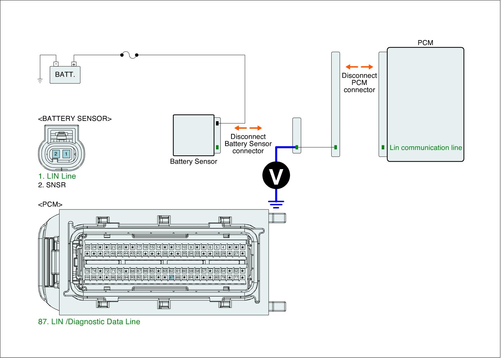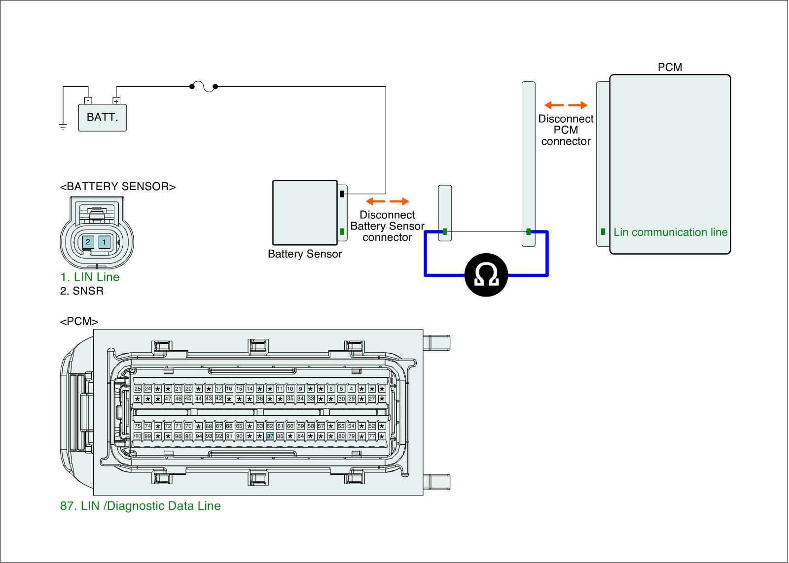 2. Check resistance between LIN terminal of battery sensor harness Connector and PCM harness connector.