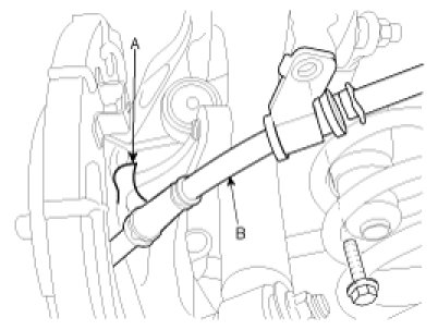 12. Remove the clip (A) and bracket mounting bolt and disconnect the parking brake cable (B) from the carrier assembly.