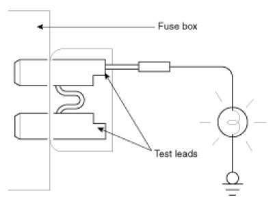 A blade type fuse test taps provided to allow checking the fuse itself without removing if from the fuse box. The fuse is good if the test lamp lights up when one lead is connected to the test taps (one at a time) and the other lead is grounded. (Turn the ignition switch so that the fuse circuit becomes operative)