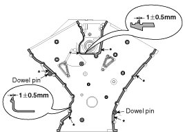 (5) The dowel pins on the cylinder block and holes on the timing chain cover should be used as a reference in order to assemble the timing chain cover to be in exact position.