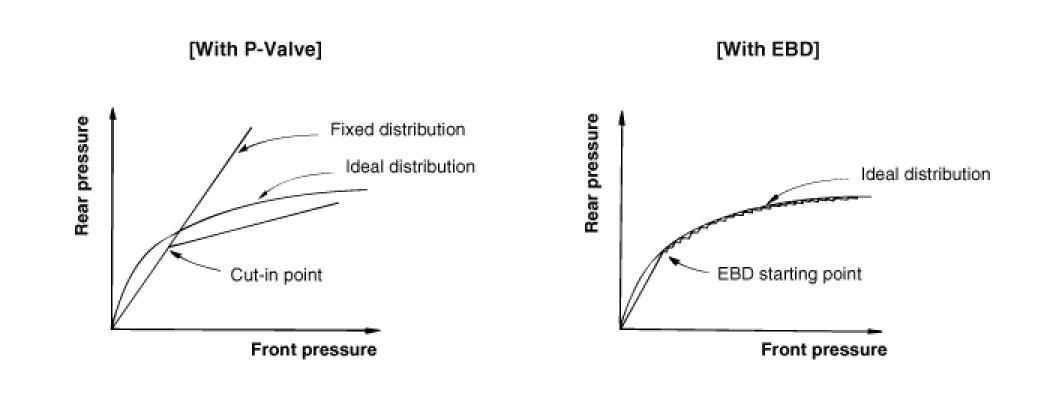 EBD controlled by the ABS Control Module, calculates the slip ratio of each wheel at all times and controls the brake pressure of the rear wheels not to exceed that of the front wheels.