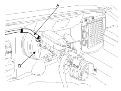 1. Disconnect the brake booster vacuum hose (check valve built in) (A) at the booster (B).