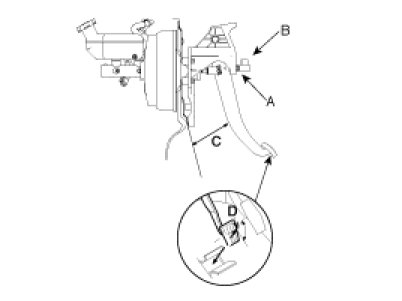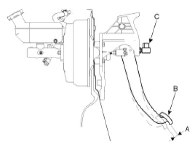 2. If the pedal free play is out of specification, adjust the brake switch (C). If the pedal free play is insufficient, it may result in brake drag.