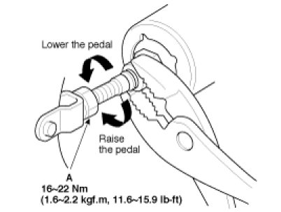 3. Loosen the pushrod locknut (A), and screw the pushrod in or out with pliers until the standard pedal height from the floor is reached. After adjustment, tighten the locknut firmly. Do not adjust the pedal height with the pushrod depressed.
