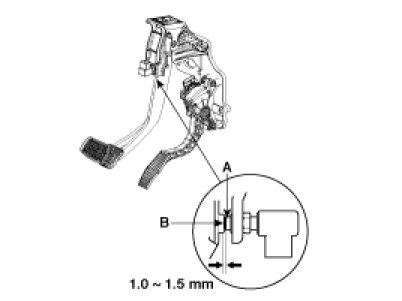 1. With the engine off, inspect the pedal free play (A) on the pedal pad (B) by pushing the pedal by hand.