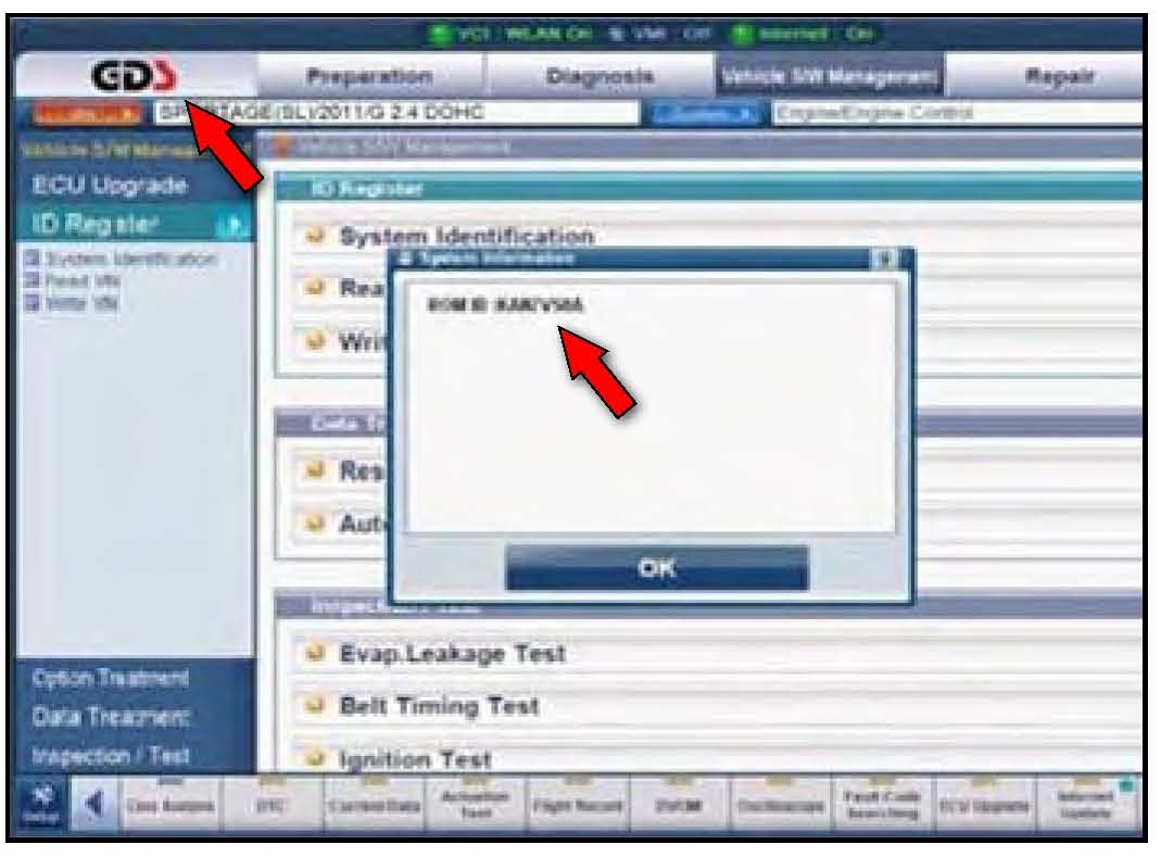 5b. Write down the "Calibration ID" or "ROM ID" number for later form entry. Next go to the main screen by clicking on the "GDS" logo at the top left of the screen.