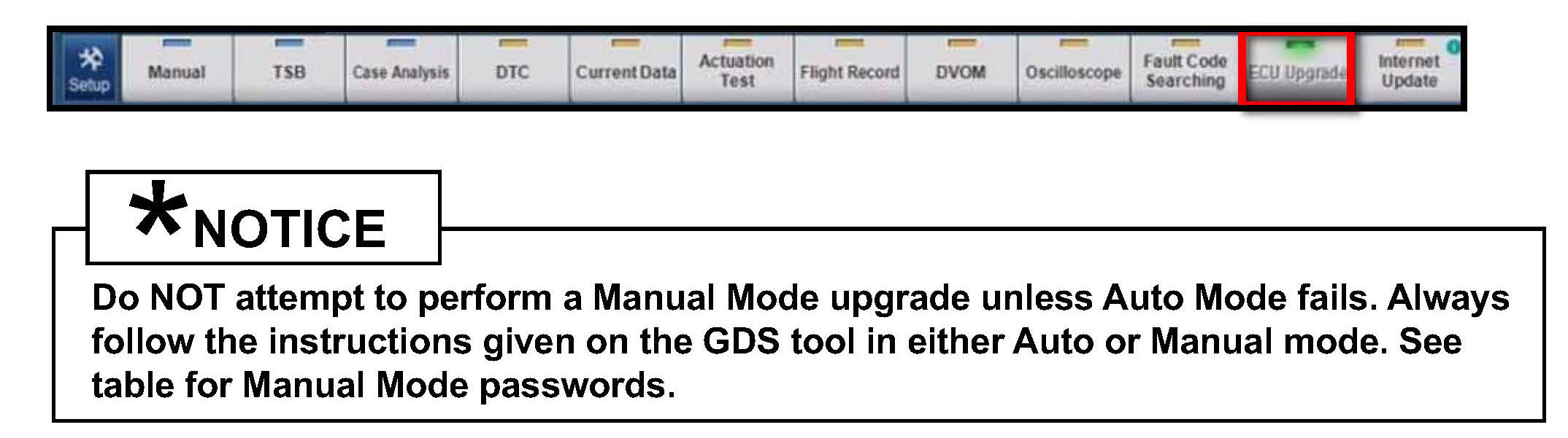 6. Once back at the GDS Main Screen, select ECU Upgrade from the bottom right-hand corner. Next select Auto Mode, and then Engine. Perform the ECM upgrade in accordance with normal GDS tool ECM upgrade procedures.