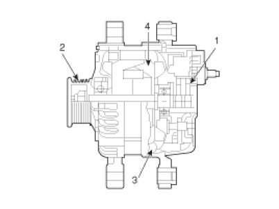 The main components of the alternator are the rotor, stator, rectifier, capacitor, brushes, bearings and V-ribbed belt pulley. The brush holder contains a built-in electronic voltage regulator.