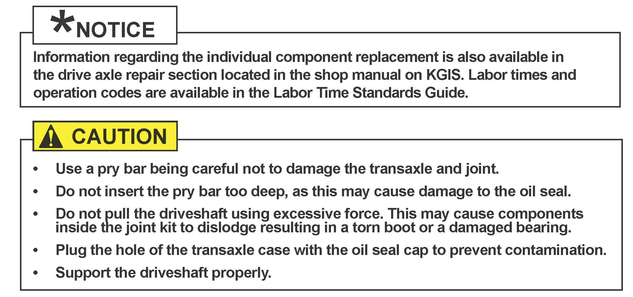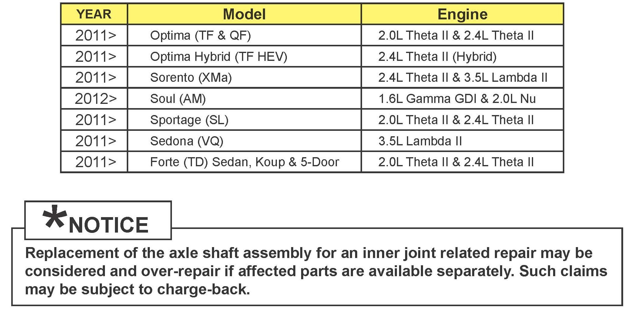 This bulletin provides information regarding axle shaft serviceability for Kia vehicles equipped with a six speed automatic transmission. Refer to the table below for a detailed list of vehicle models. Individual service parts such as axle boots, joints, and hardware for inner joint are now available through your parts department.