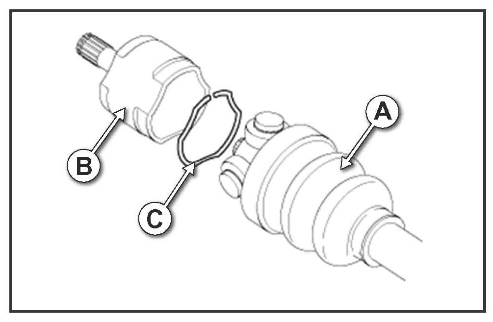 4. Carefully remove retaining clip (C) (if equipped) from tripod joint case (B) using snap-ring pliers or an equivalent tool.