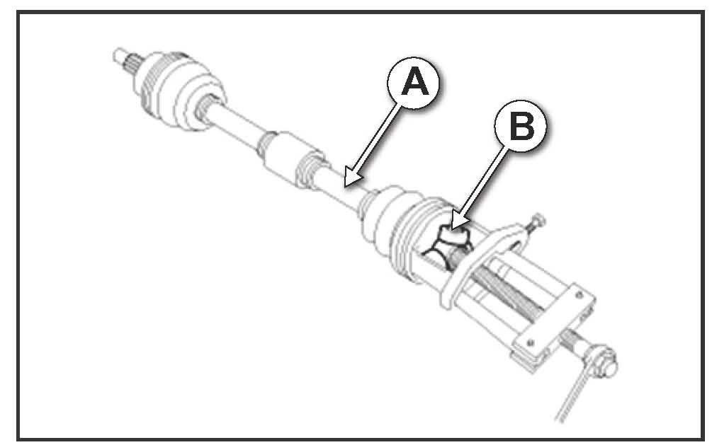 7. Carefully remove the trunnion assy. (B) from the driveshaft (A) using a suitable puller. Use a shop towel to remove any excess grease.