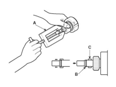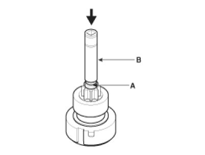 Using a suitable pulling tool (A), pull the overrunning clutch stopper (C) over the stop ring (B).