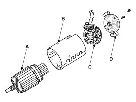 4. Remove the armature (A), the yoke (B), the brush holder assembly (C), and the rear housing (D).