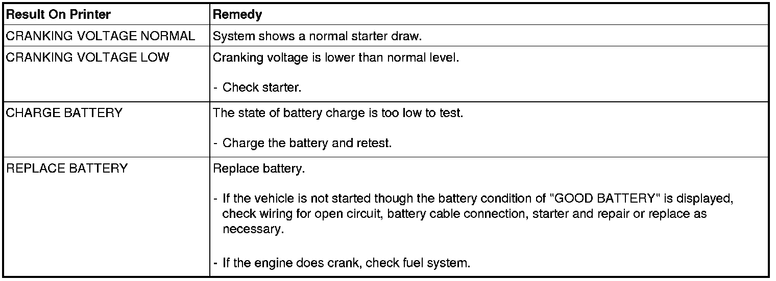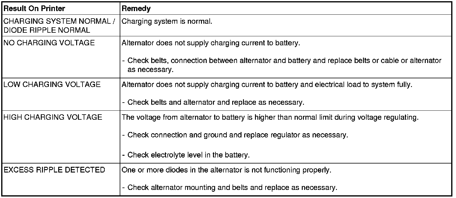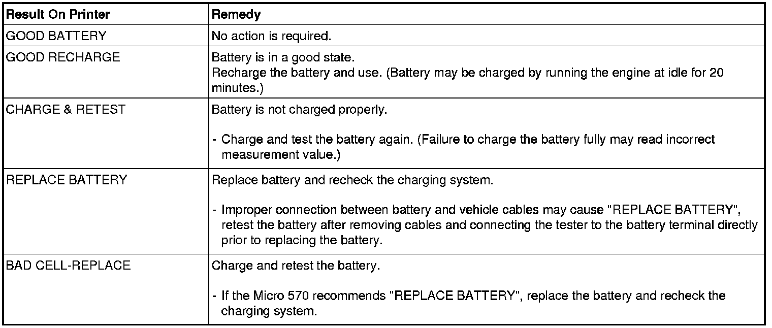 Shut off engine end disconnect the tester clamps from the battery. Refer to the following table and take the appropriate action as recommended by the Micro 570.