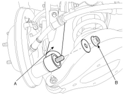 4. Remove the rear shock absorber assembly nut (B) from the rear knuckle, then remove the shock absorber assembly (A).