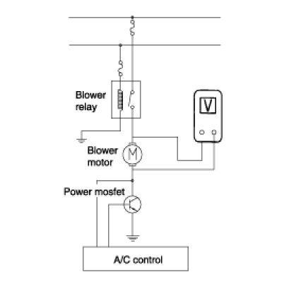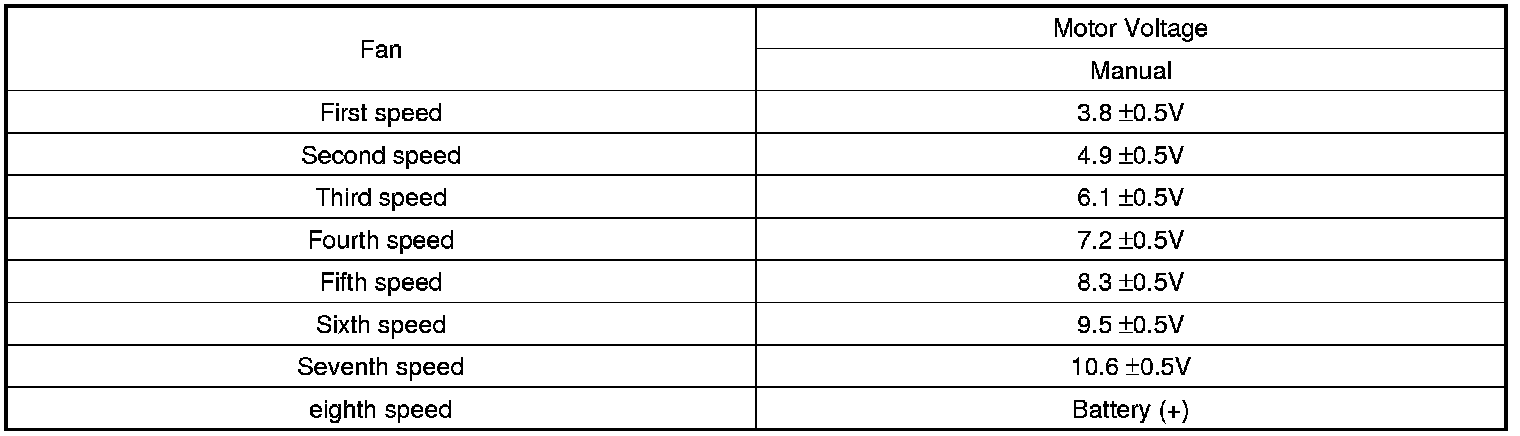 2. Manually operate the control switch and measure the voltage of blower motor between pin 1 and 2.