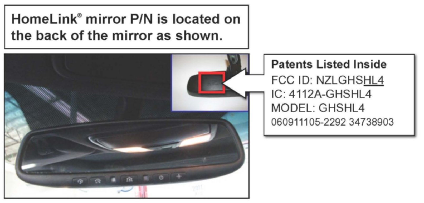 The figure above shows how to identify HomeLink(R) IV mirrors, based on the FCC ID, which is laser-marked onto the rear housing of the mirror. "HL4" signifies HomeLink(R) IV, whereas "HL3" signifies HomeLink(R) III.