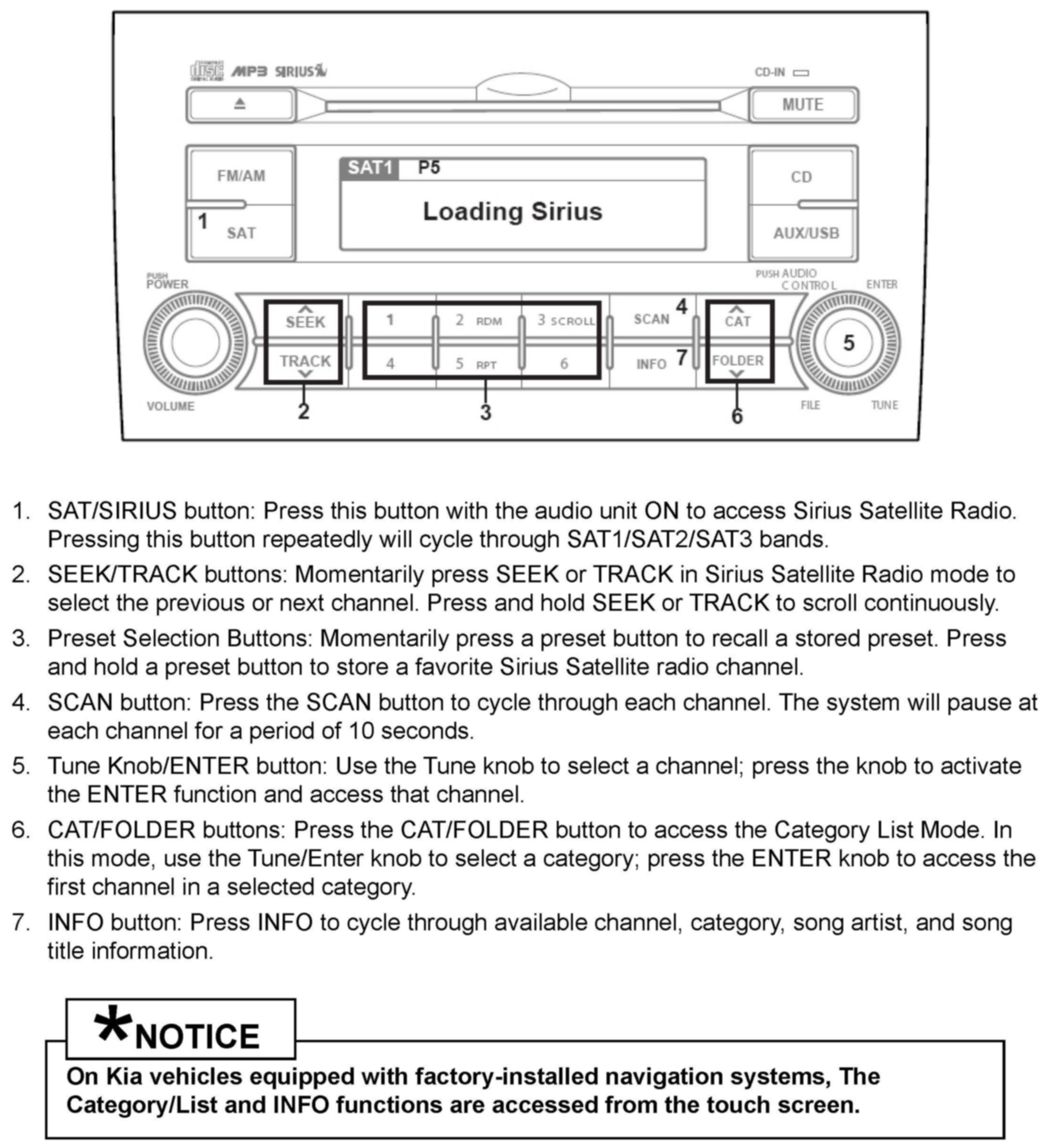 This bulletin provides needed to confirm normal operation and perform basic troubleshooting on Kia models equipped with factory-installed Sirius satellite radio.