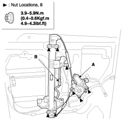 2. After disconnecting the connector (B), remove the power window motor (A).
