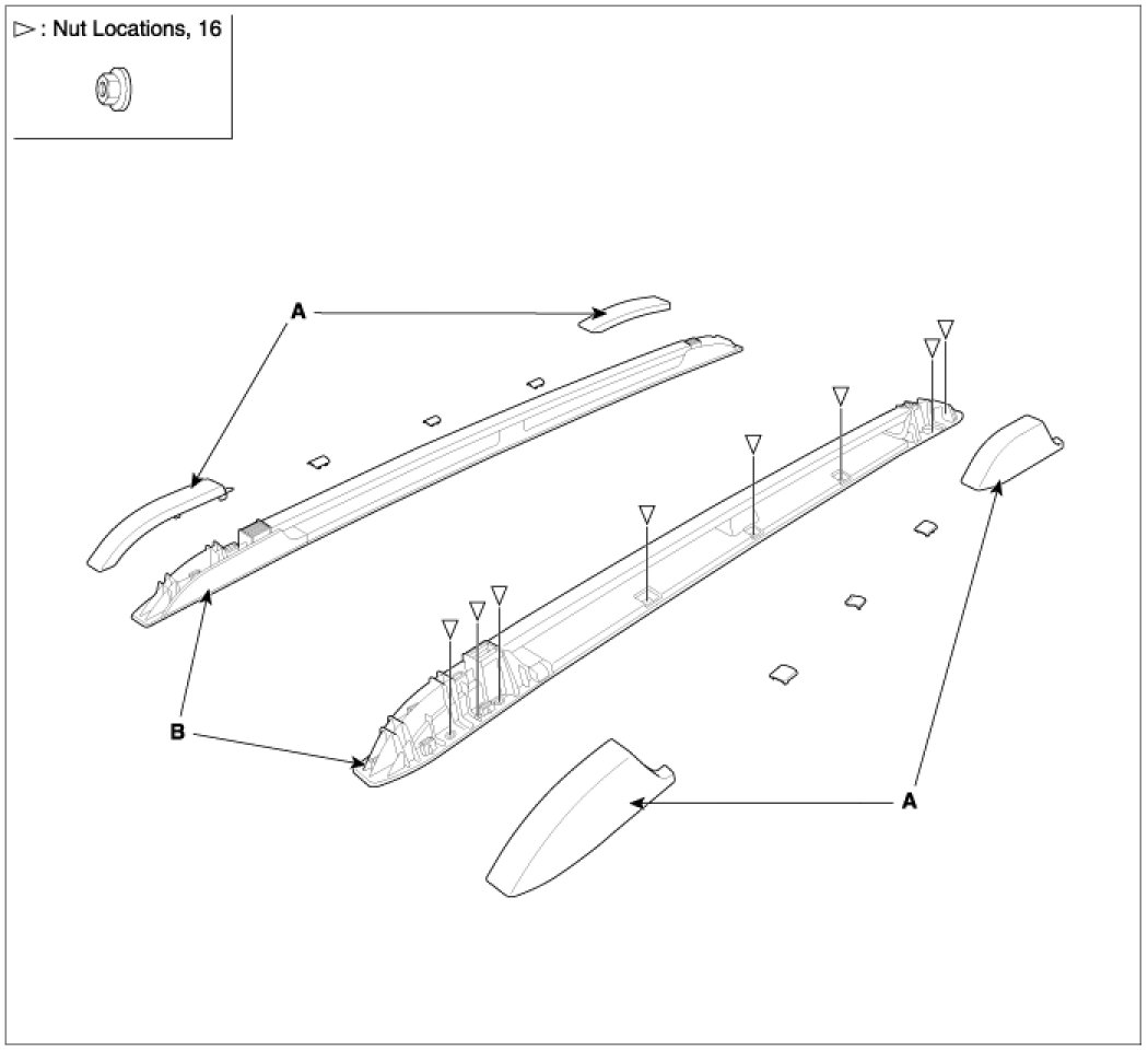 2. Remove the roof rack (B), by removing nut protector covers, and removing the nuts.