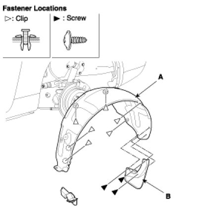 1. Remove the wheel guard (B) first by removing the clip and screw, then remove the wheel guard(A), by removing the screws and clip.