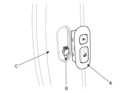2. Disconnect the connector (B) after removing the sliding power window switch (A) from the B pillar trim (C).